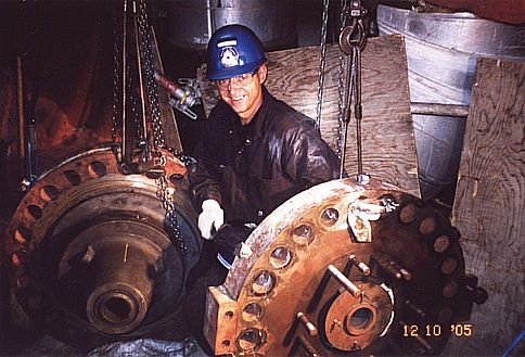 Above we see Attila's partner , Emile Bisson also obviously right at home inside these "pretty yellow machines" . The job of these two capable Millwrights is to 'change-out' these many large high-tensile studs (bolts)