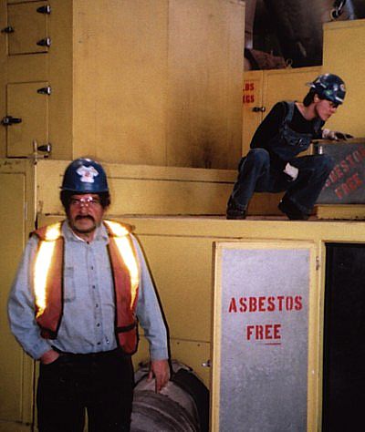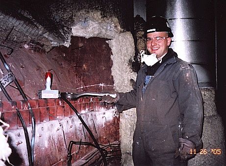 Yep , this is one of those places we talked about earlier . Maybe not the most comfortable place to be , but this is where the action is . Dust mask is not an option , but is an essential piece of equipment as is the large hammer wrench in the hand of Attila Tiffan . Judging by the smile , I'd say Attila is destined to be a Pro ... once he finishes