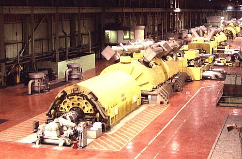 Above is a photo Zsa-Zsa Gabor snapped while hang gliding through this huge power plant . A kilometer long , it pumps out 4 gigawatts of juice via eight 500,000 watt steam driven generators . To some viewers it may very well seem like a nice picture of some pretty yellow machines . Hydro employees understand that the total process to creating this much electricity is both elaborate and complex . The simplest solution to the end result is breaking it down into 'pieces of the puzzle' ... each team member of each department learning their contribution as fully as they are able .