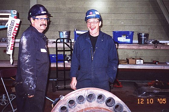Above we see Mike Adamson and Dawn Hannah getting ready to start ripping this thing apart ! Err , I mean getting ready to disassemble the steam inlet end of the Unit 1 Steam Turbine . This particular contract has been awarded to Siemens-Canada , and involves some pretty heavy-duty disassembly work and more importantly , many extremely intricate re-assembly procedures .