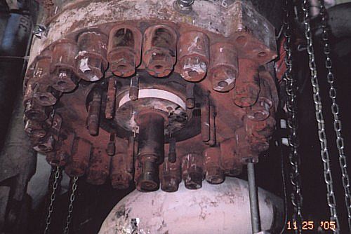 Above we see Attila's partner , Emile Bisson also obviously right at home inside these "pretty yellow machines" . The job of these two capable Millwrights is to 'change-out' these many large high-tensile studs (bolts)